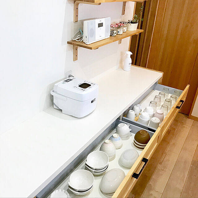 カウンターに置くものや、引き出しの中身も厳選すればより整った印象が強くなります。普段使いの食器を並べた引き出しの中は、どこに何があるのか一目瞭然。毎日の料理の準備や、片付けもスムーズにできるのではないでしょうか。家族みんなが分かりやすいというメリットもありそうです。
