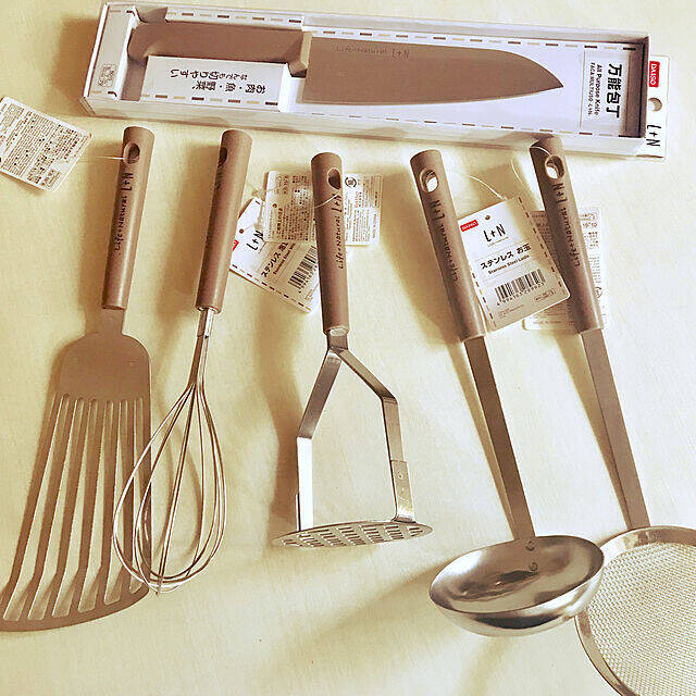 naturalさんはL+Nの調理器具をたくさん購入されました。シリーズでそろえると統一感が出て良いですね。優しいカラーと手書き風のロゴのデザインで、キッチンの雰囲気も優しくなりそうです。ステンレス製なので強度があり、長く使えますよ。