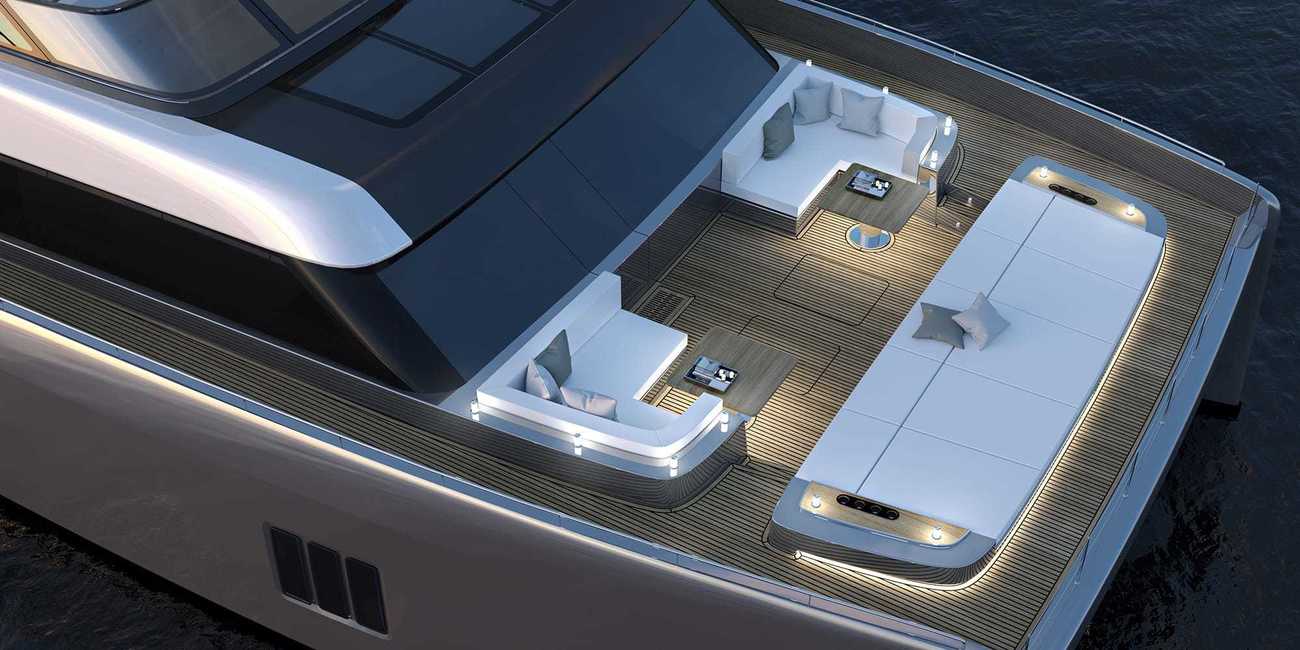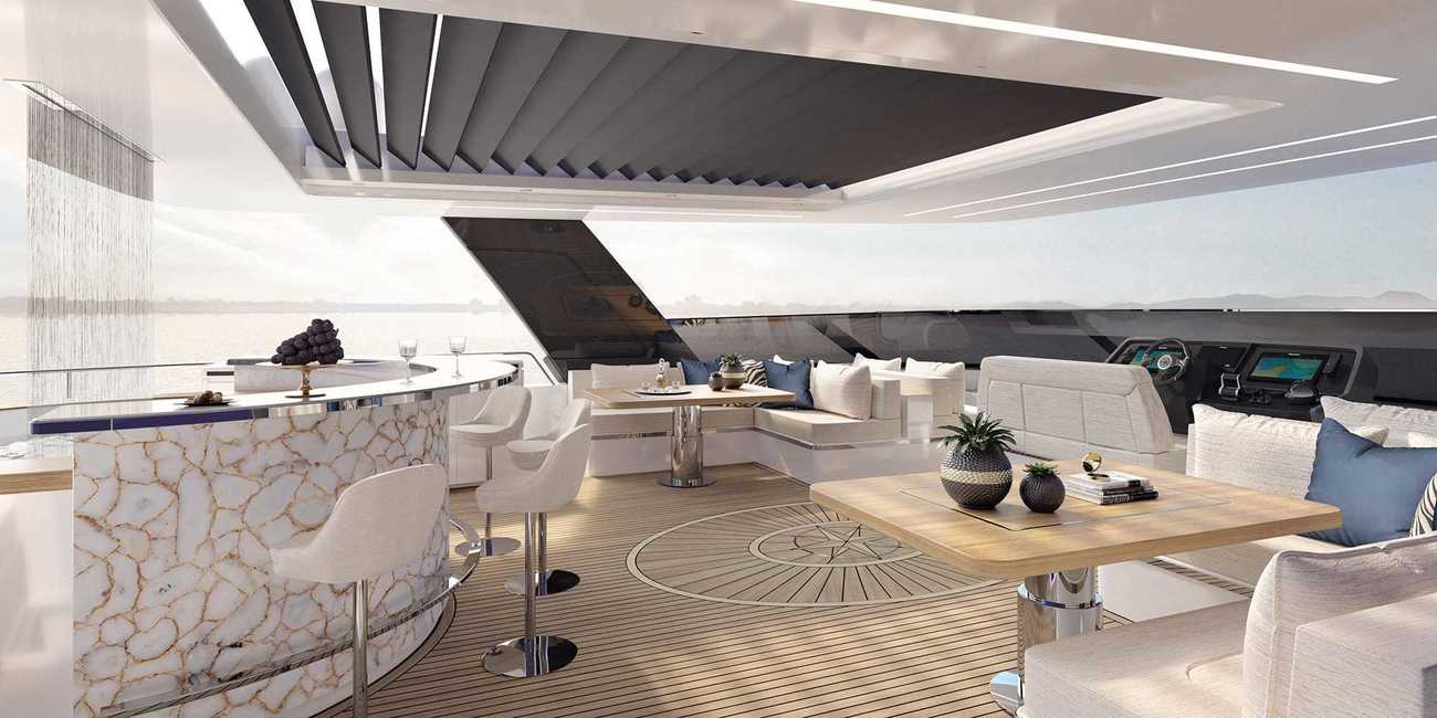 Alle Fähigkeiten, die von denen geliebt werden, die das Meer lieben, wie Nadal. Es wurde für lange Kreuzfahrten dank eines eingebauten Mehrrumpfboots mit einem starken Antrieb von zwei 1200-PS-Motoren entwickelt. Die Yacht verfügt über eine Garage für Wasserfahrzeuge und viele Wohnräume, darunter eine Flybridge, auf der eine Wanne und eine Wet Bar untergebracht werden können.