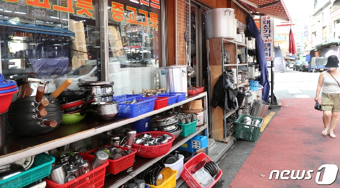 (서울=뉴스1) 김명섭 기자 = 신종 코로나바이러스 감염증(코로나19) 재확산으로 외식업계에 폐업은 많아도 창업은 없는 가운데 30일 서울 중구 황학둥 주방거리에 중고 주방 용품들이 놓여져 있다. 2020.8.30/뉴스1