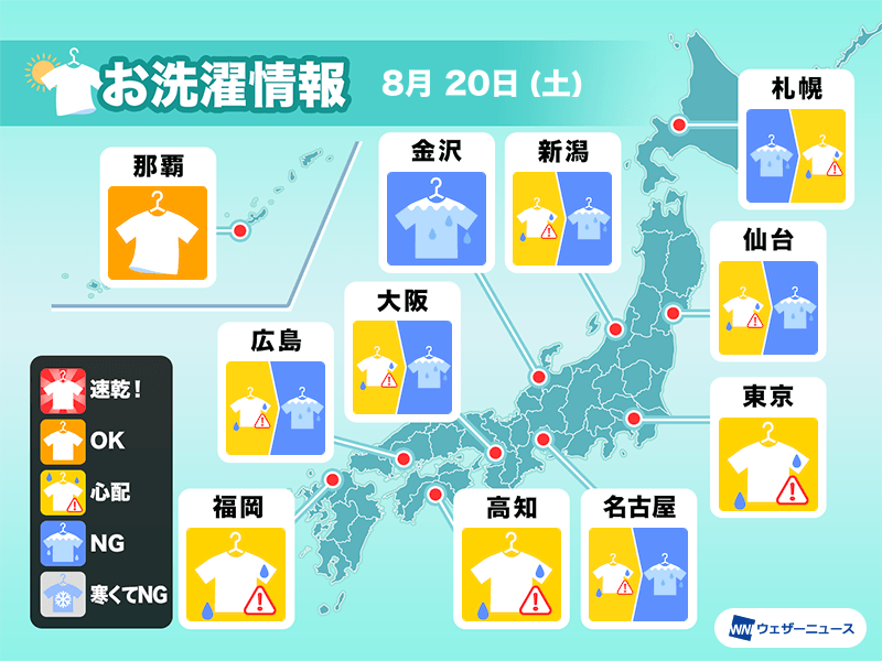 関東や四国などの太平洋側もすっきりしない空で、にわか雨の可能性があります。外干しをする場合は空の様子をみつつ、外出する際には取り込むようにしてください。