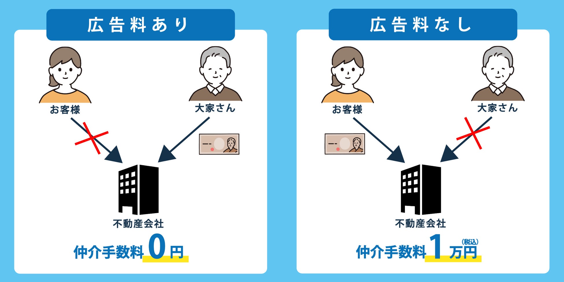 ADとは、大家さんが「入居者を決めてくれた不動産屋さんに支払う報酬額」のことで、支払われるかどうかは大家さん次第(物件次第)です。 ADが1ヶ月分支払われる場合は、不動産屋さんは入居者と貸主の両方から合計家賃2ヶ月分もいただいていることになります。