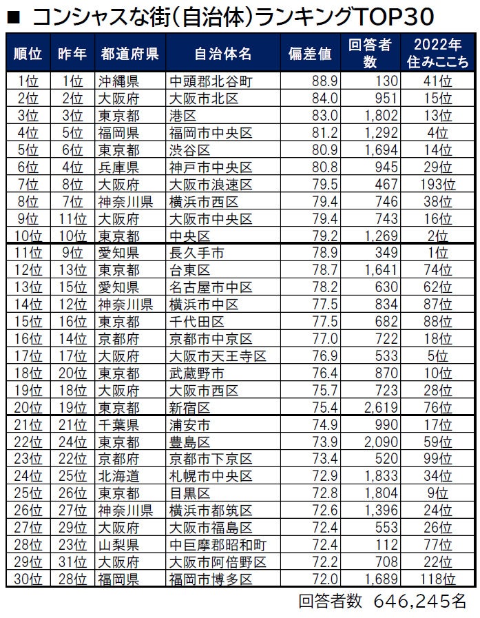 ■「コンシャスな街(自治体)」トップ3は、昨年と変わらず沖縄県中頭郡北谷町、大阪府大阪市北区、東京都港区