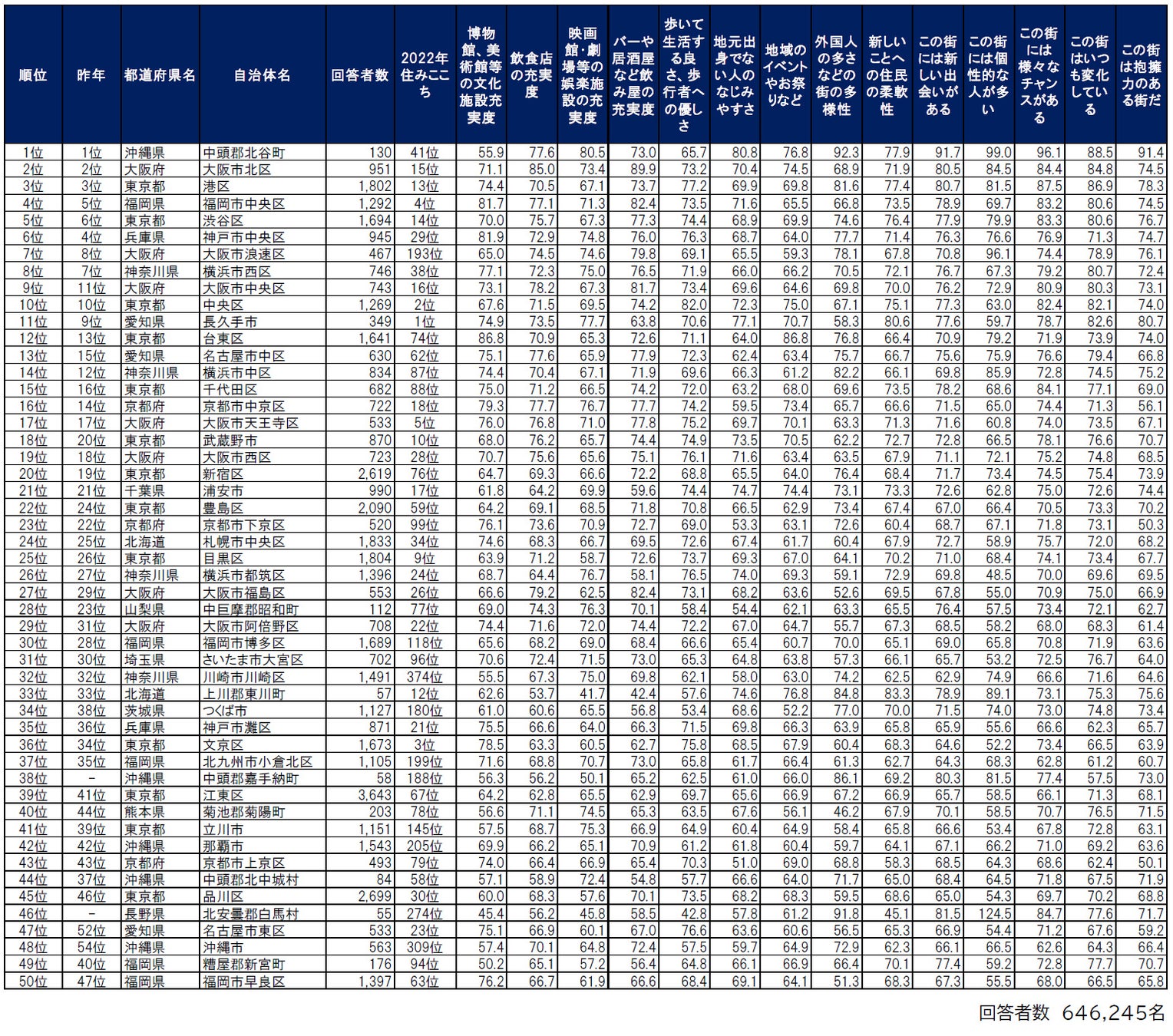 1位は、3年連続で沖縄県中頭郡北谷町です。2位は2年連続で大阪府大阪市北区、3位も2年連続で東京都港区で、トップ3は昨年と全く同じ結果となっています。トップ10では、東京都と大阪府が最も多く3自治体ずつランクインしている他、沖縄県、福岡県、兵庫県、神奈川県の自治体もランクインしており、昨年と比較しても顔ぶれに大きな変動はありません。